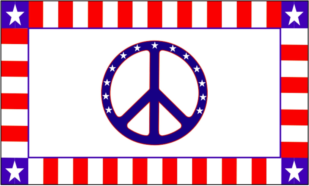 Its border carries 50 red-and-white stripes for every state, with white stars in each corner representing the North, South, East, and West that shape this nation. Around the classic 1960s peace symbol, 13 stars honor the original colonies — the roots of American liberty.